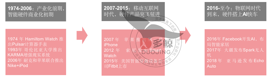 根据国外的智能硬件发展历史,我们大致可分为三个时期:产业化前期、移动互联网时期和互联网时代。