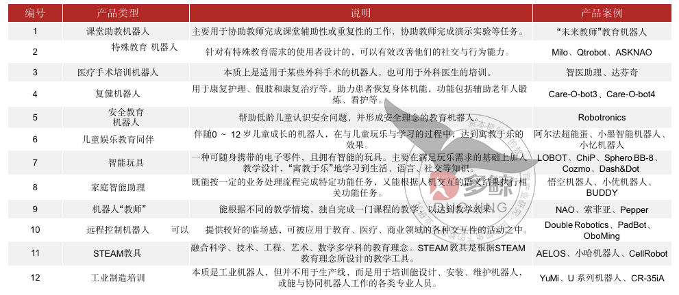 从市场发展现状来看,主要集中在家庭和学校场域中使用,如家庭中的智能玩具、儿童娱乐教育同伴、家庭智能助理;学校一般教室与专用教室的远程控制机器人、 STEAM 教具;专用教室或培训机构的自闭症特殊教育机器人。
