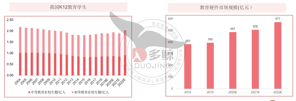 教育硬件市场规模稳步增长:2020 年受疫情影响,学生在线接收教育人数迅速增加,所带来的是对教育硬件设备需求的陡增,随着学生返校复课,在线教育留存率会有所下降,但预计呈稳步增加态势,预计至 2022 年,K12 教育智能硬件市场规模将达 570 亿。