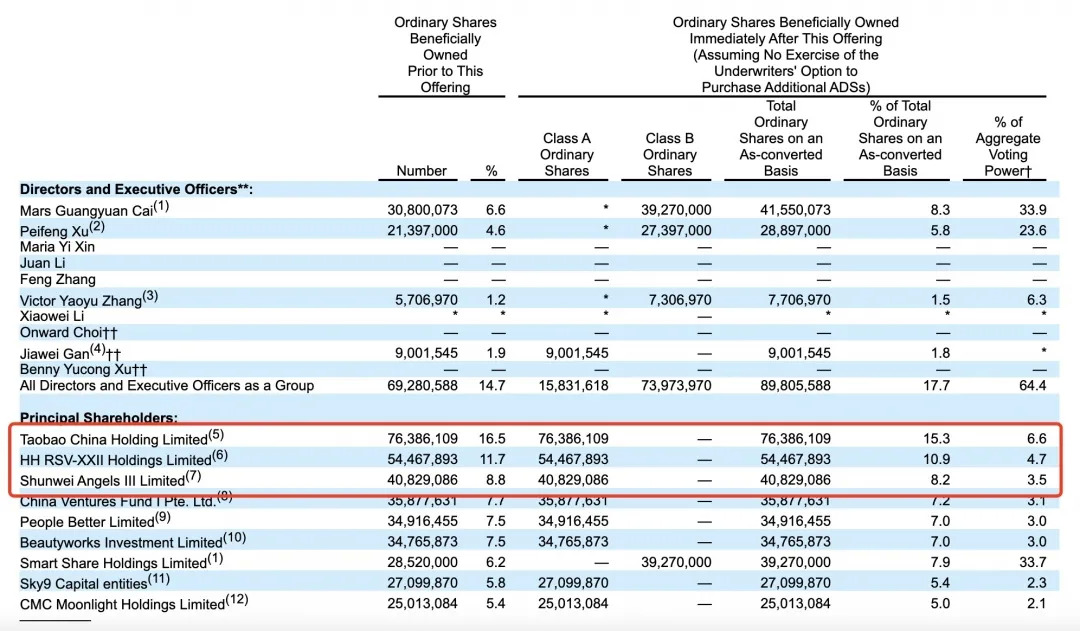招股书显示,机构股东中,阿里巴巴通过淘宝中国持股16.5%,为怪兽充电单一大股东;高瓴资本持股11.7%,顺为资本持股8.8%,软银亚洲持股7.7%,小米、新天域均持股7.5%,云九和CMC分别持股5.8%、5.4%。
