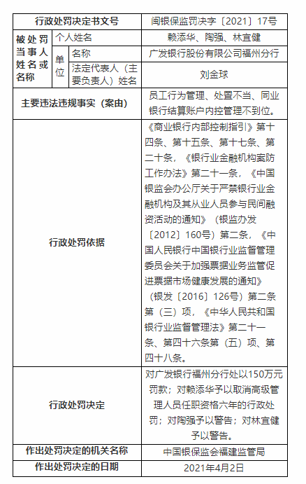 银保监会官网4月2日消息,据福建银保监局行政处罚信息公开表,广发银行股份有限公司福州分行因员工行为管理、处置不当、同业银行结算账户内控管理不到位,被处以150万元罚款。