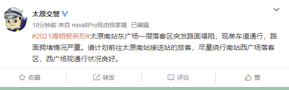 @太原交警 微博4月3日消息,太原南站东广场一层落客区突发路面塌陷,现单车道通行,路面拥堵情况严重。请计划前往太原南站接送站的旅客,尽量绕行南站西广场落客区,西广场现通行状况良好。