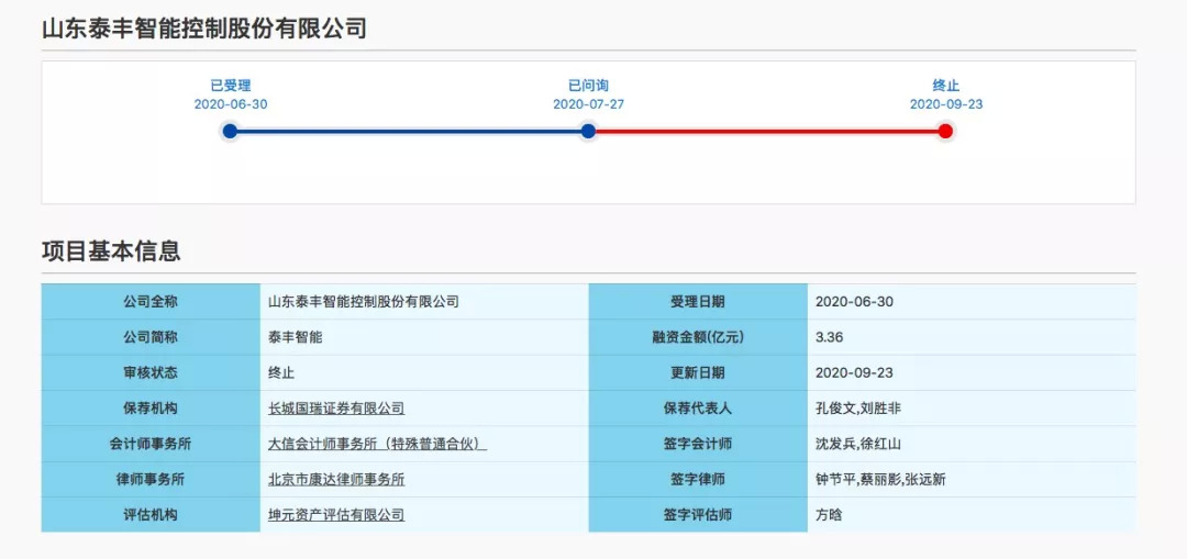 在随后的9月22日,泰丰智能保荐人长城国瑞证券向上交所提交撤回公司首发并在科创板上市申请文件。根据有关规定,上交所决定终止对泰丰智能首发并在科创板上市的审核。