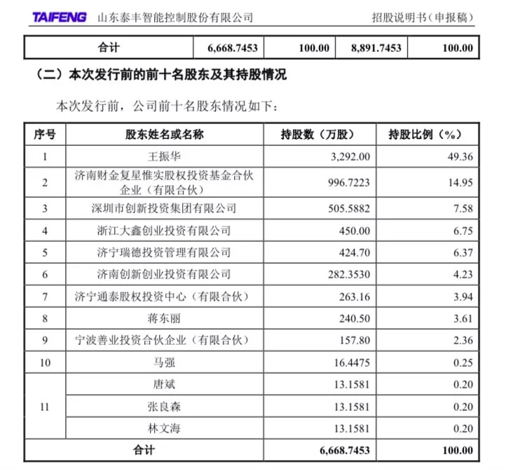 在冲刺科创板的招股书中,泰丰智能披露,王振华直接持有公司49.36%的股份,系公司控股股东。王振华妻子蒋东丽直接持有泰丰智能3.61%的股份。