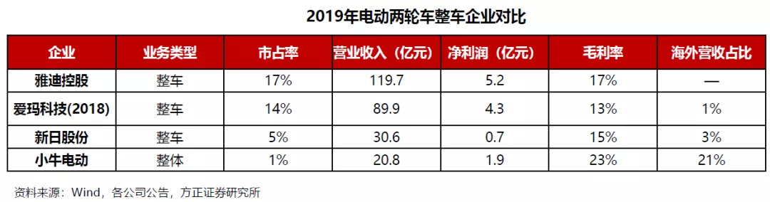 有意思的是,从公开信息看,雅迪似乎并没有公开国际市场在收入,只是在财报中描述“本集团逾90%的收入及经营利润产生自电动两轮车在中国的销售,且本集团逾90%的非流动资产及负债均位于中国”。此外,方正证券对2019年国内主要电瓶车企业的收入占比进行的统计,雅迪的海外营收也是未经统计。