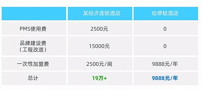 哈啰轻酒店和某经济连锁酒店加盟费对比。图片来源:tech星球
