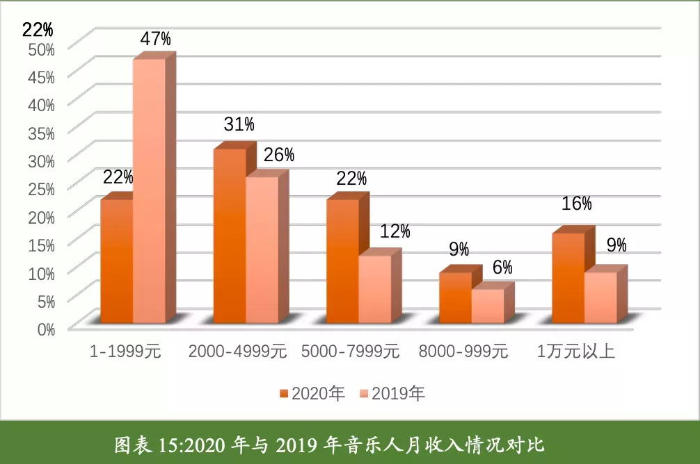 去年底发布的《2020年中国音乐人报告》里,仅一年时间,音乐人月收入不足2000元的占比已经下降到22%,音乐收入占总收入5%以内的比例也降至24%,音乐人的收入状况明显好转,正走出“温饱”困局。