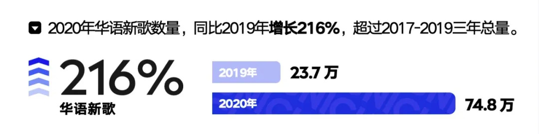 这是《白皮书》公布的第一组重磅数据。前者是2020年华语新歌的同比增长幅度,后者是2020年全年生产的新歌数量,其超过了2017-2019三年的总量。