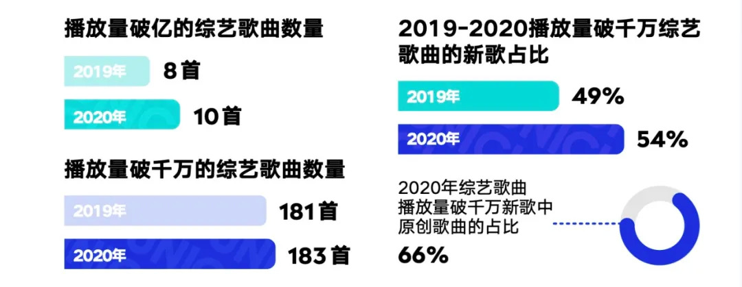 内容上,《白皮书》显示,2020年的音综内容正从“经典内容”向“新生原创内容”转移。全年破千万播放的综艺歌里,新歌占比54%,原创歌曲占比达到66%,仅《明日之子》一档节目就推出了超百首原创歌曲。