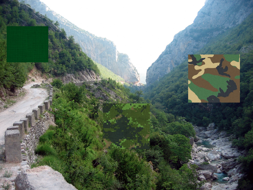 下面这张图片揭示了像素化迷彩伪装(中)是如何在自然环境中起作用的: