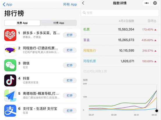 随着“机票目的地盲盒”引爆社交媒体,4月3日,微信指数“同程旅行”的搜索热量日环比增长超过318%,“盲盒”搜索量日环比增长超过435%。APPstore免费APP排行上,同程旅行APP的排名上升到总榜第二位、旅行类榜单第一位。且网友纷纷自发在抖音、小红书上发起话题,晒出自己抽中的目的地。截止至4月3日,抖音上,用户自发的“机票盲盒”话题的播放量已经近1亿。