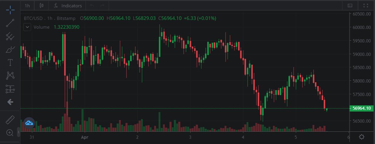 4月5日消息,Bitstamp平台报价显示,比特币回落至57000美元/枚下方,日内跌超2%。