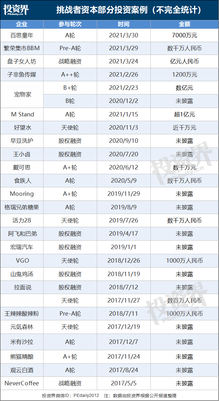 同月,早教玩具百思童年、新零售品牌繁荣集市BBM等背后都出现了挑战者资本的名字。月前挑战者还接连投资了连锁咖啡M Stand、宠物家、子非鱼传媒, 并在很久前就将拉面说、熊猫精酿、王小卤、王辣辣酸辣粉等收入囊中。