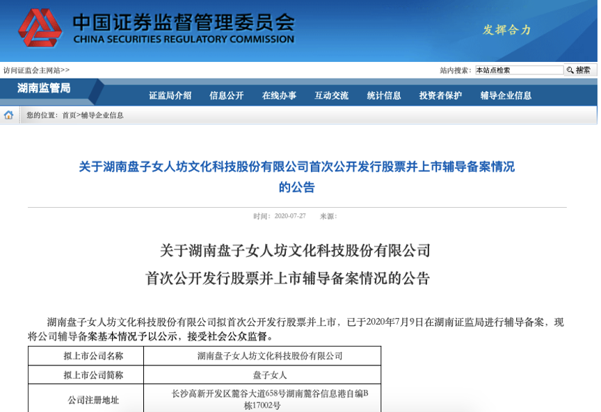 除了元气森林,唐彬森也将有望斩获一个IPO。投资界了解到,2020年底,由唐彬森执掌的VC机构——挑战者资本斥资亿元投资了盘子女人坊。而在获得这笔融资前,盘子女人坊曾出现在长沙市金融办公布的长沙市2020年拟上市(挂牌)企业名单中。2020年7月,证监会官网也对盘子女人坊首次公开发行股票并上市辅导备案情况发布了公告。