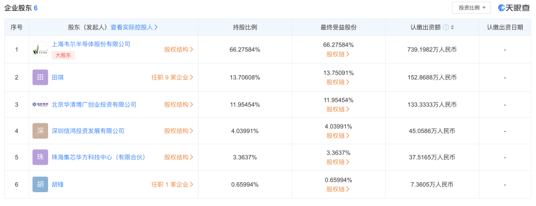 近期,深圳前海维晟智能技术有限公司(简称“前海维晟”)发生工商变更,新增股东平潭冯源绘芯股权投资合伙企业(有限合伙)。后者股权穿透后发现,该投资机构的关联方是半导体龙头上市公司韦尔股份实控人虞仁荣,其间接持有深圳前海维晟智能股份约为2%。