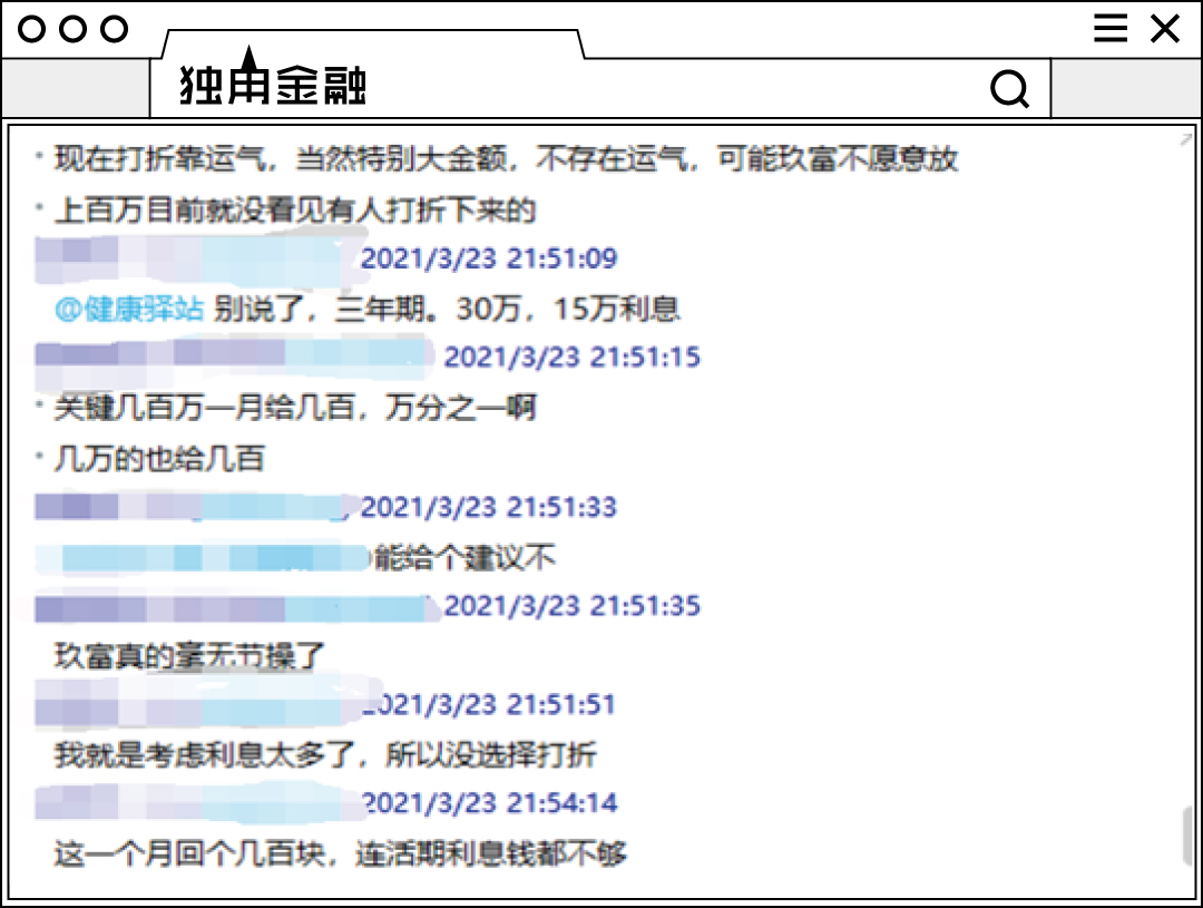 “现在打折也要靠运气,上百万的金额就不存在运气,因为没看到有一人个能下车的!”玖富的一位投资人在QQ群里这样吐槽。