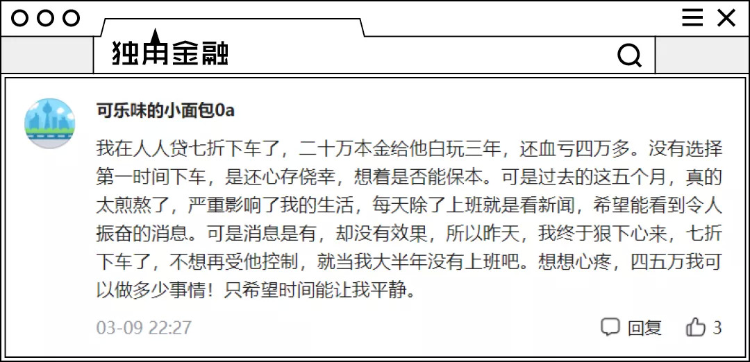 一位人人贷的投资人告诉独角金融,已经6折“下车了”。但他对此并不满意。