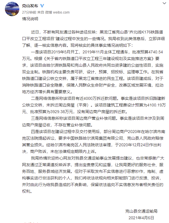 中共克山县委网络安全和信息化领导小组办公室官方微博消息,克山县交通运输局2021年4月6日发布《情况说明》称,近日,不断有网友通过各种途径反映:黑龙江省克山县“齐北线K176铁路道口平改立工程项目”建设过程中发生的一些情况。克山县交通运输局收到此类信息后,立即详细了解、逐一核实信息内容。现将核实的具体事实情况说明如下:
