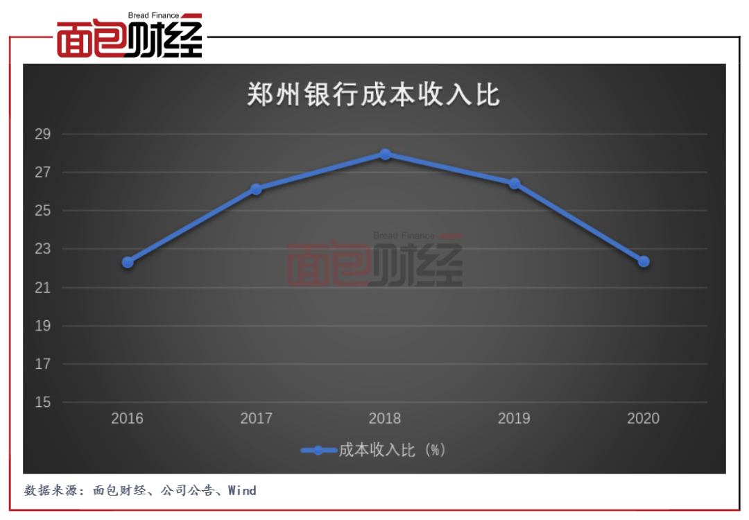 截至2020年末,郑州银行的成本收入比为22.40%,较上年末下降4.06个百分点,成本收入比连续两年出现下降。