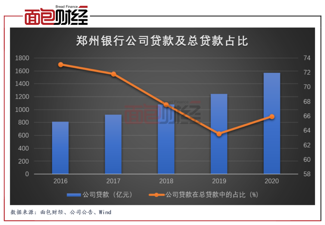 年报显示,郑州银行的公司贷款主要围绕“商贸金融、小微金融、市民金融”三大特色业务,截至2020年末,该行公司贷款总额为1569.54亿元,占该行贷款总额的65.96%,较上年末增加人民币323.88亿元,增幅为26%。