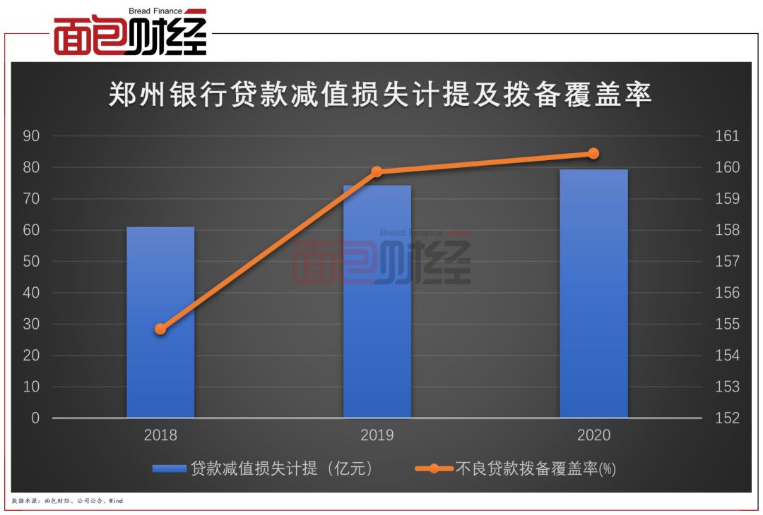 除了不良贷款率,2020年郑州银行加大了贷款减值损失计提力度,该行拨备覆盖率提升至160%以上。