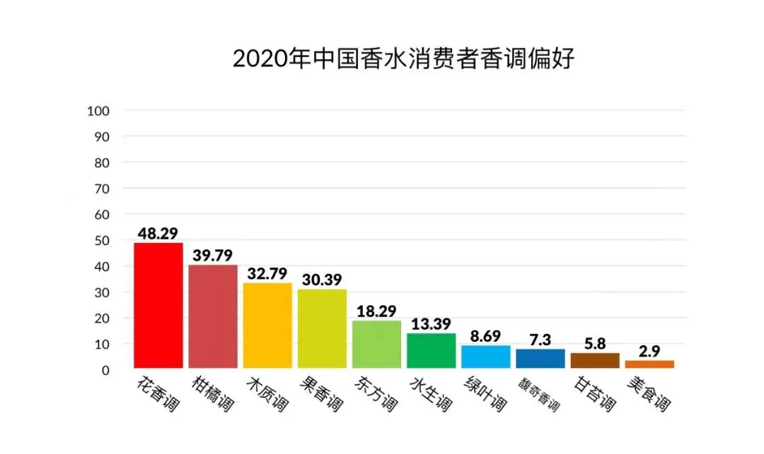 结合《白皮书》的调查,被访者中有将近80%的用户选择当前使用的香水,是因为喜欢产品的香味,而在香水消费者香调偏好调查中,以偏好花果香、柑橘香和木质调为主。呈现出未来国内香氛调制以清新香调和中性香调为主,可以更好的迎合国内消费群体的趋势。