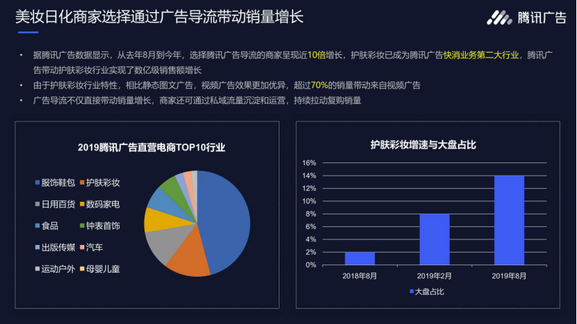 又岂止一个完美日记、梵蜜琳,本土美妆日化品牌正集体向广告导流“砸重金”。由腾讯广告提供的数据显示,美妆日化商家为私域引流而投入的广告导流费用呈10倍速增长,护肤彩妆已经成为腾讯广告快消业务第二大行业。