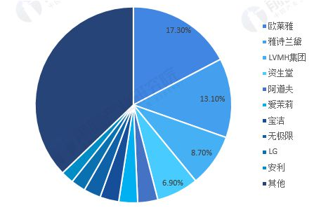 来自前瞻产业研究院一份调查报告显示,2019年,市场份额排名前20的化妆品企业中,欧莱雅、宝洁、雅诗兰黛、资生堂和LVMH集团分别占据前5名,而它们均是海外知名化妆品企业,五个品牌2019年占据了约30%的市场份额。
