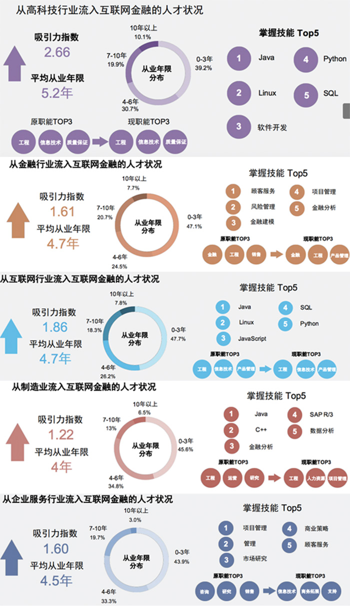 拥有不同行业背景的人才进入互联网金融行业后表现的特点各不相同。于互联网及金融从这两个行业流入的人才平均从业年限都是4.7年,且更多是从业经验在0-3年的初级人才。来自这两个行业的人才除了原职能之外,较多从事产品管理工作。流入互联网金融的高科技人才平均从业年限较长,达到5.2年,并且他们在转到互联网金融行业后,依然继续从事工程、信息技术、质量保证等技术职能。此外,互金行业对服务业、制造业等行业人员也有很大吸引力。