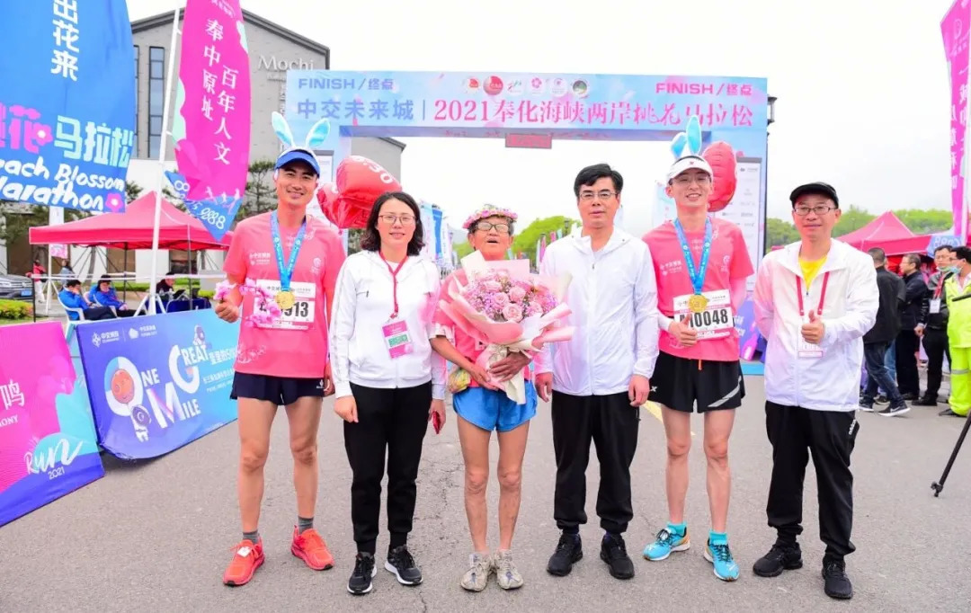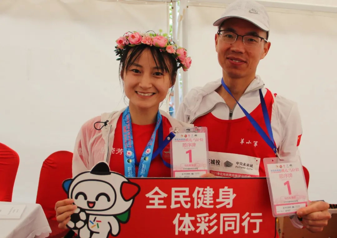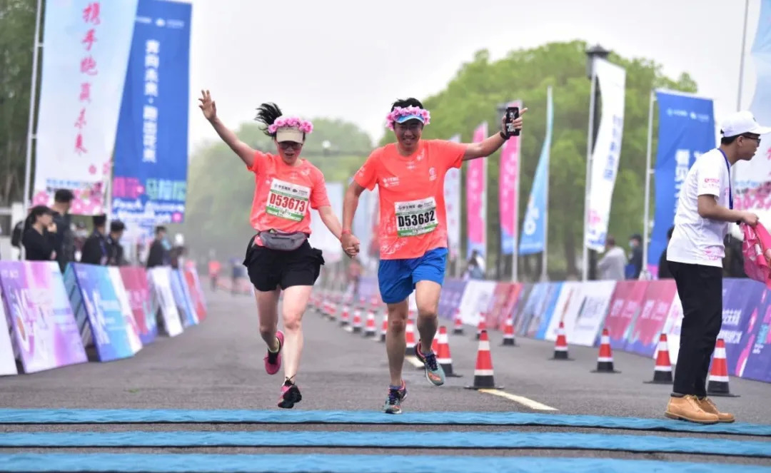 现场尤为吸睛的是一对对牵手冲线的“夫妻档”,本届桃花马共有58对夫妻参与“情定今生”项目,婚龄最长的35年,最短的仅1个月。赛事自2017年创办至今,赛事组委会一直保留着传统爱情主题特色活动“桃花见证,情定今生”,夫妻档运动员报名参与即可领取“情定今生”号码布,共跑浪漫的桃花赛道。