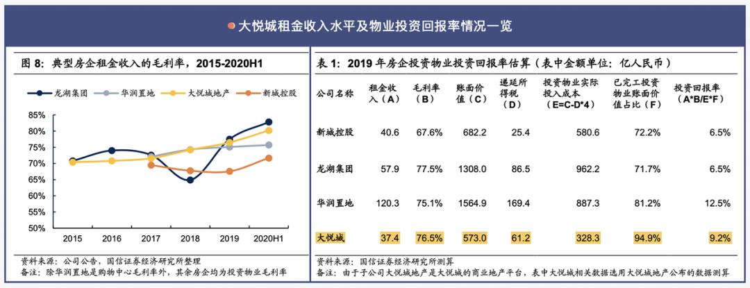 从结果来看,大悦城的运营能力受到了品牌商的认可。财报显示,大悦城旗下购物中心2020年全年的平均出租率达93.9%。国信证券研报显示,2019年,在租金收入毛利率上,大悦城优于华润置地和新城控股,投资物业的回报率也领先新城控股和龙湖集团近3个百分点。