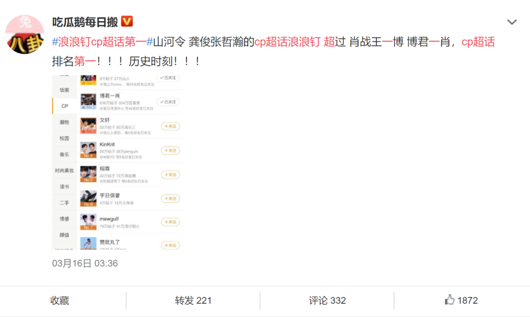 刚刚剧终的《山河令》就更加现象级了。主角两人的cp超话“浪浪钉”一度短暂反超传统cp劲旅“博君一肖”(王一博和肖战的cp超话)登上cp榜榜首。