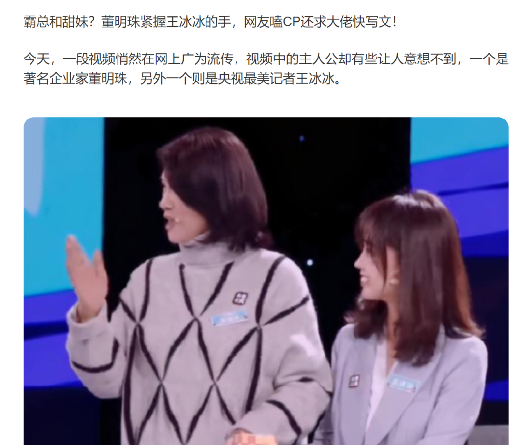 参与综艺《创造营2021》的选手利路修和普京的拉郎视频,在b站播放量已经超160万;德云社里,德云女孩嗑起了龄龙少年(张九龄王九龙),脱口秀大会上风驰电掣的“雪国列车”(李雪琴王建国),搭载起不少的节目关注度。神奇的网友还在一期央视新闻助力大学生就业的公益直播中,抠出了董明珠和王冰冰的cp感。
