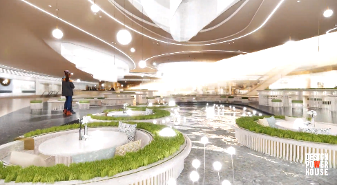 从二层倾泻而下的水幕,随四季变化色彩的灌木藤蔓,一层直接和室外景观相接,打造绿植,水景,餐饮,舞台为一体的多元化生态空间。