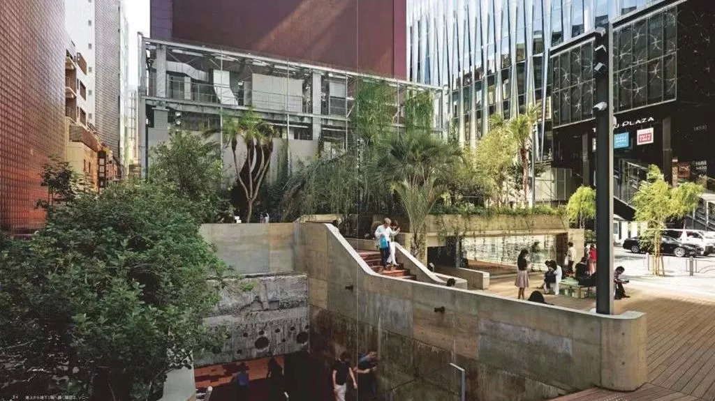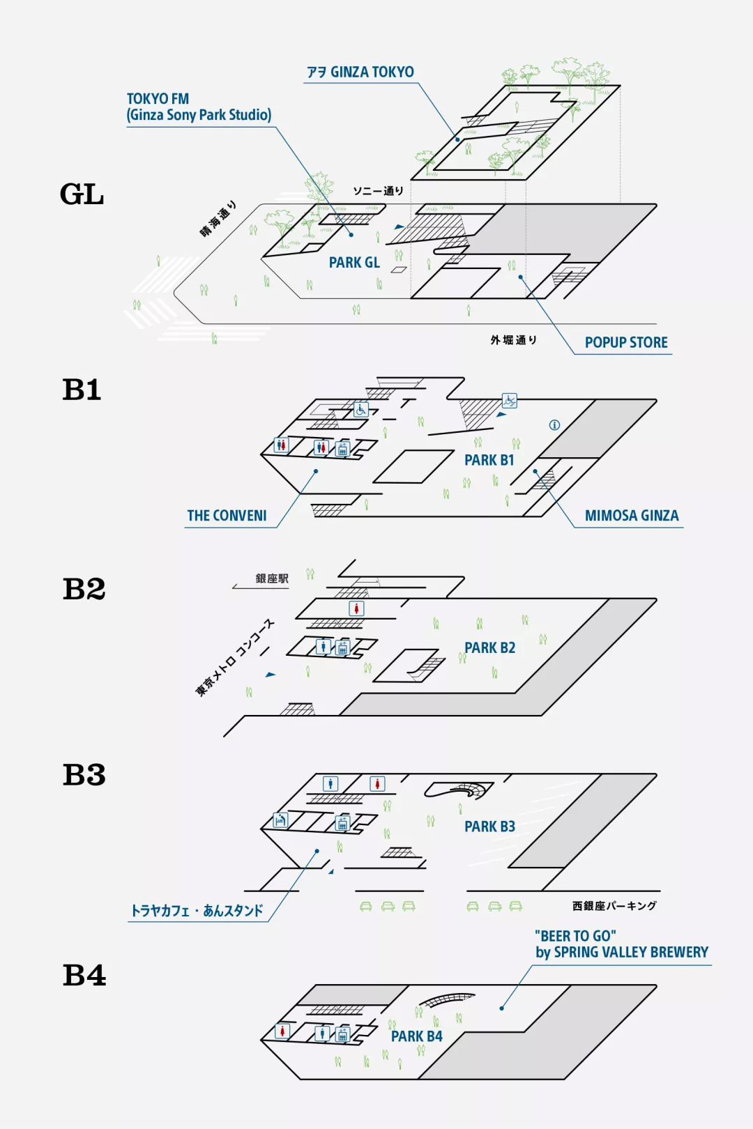 所以在寸金尺土的银座里,Sony Park既是一个供游客休息的公园,也是一个连同着东京地铁「银座站」且有着地下四层空间的艺术商业广场。