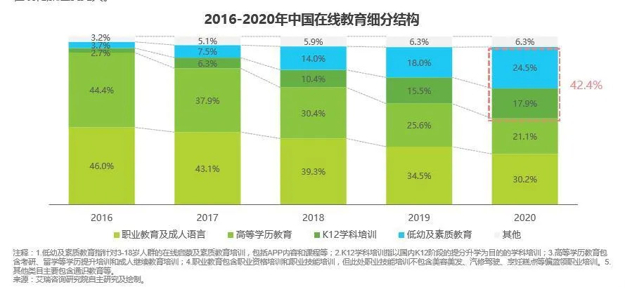 这是近年来逐渐明确的趋势:80、90后的家长们越发重视素质教育。据艾媒咨询报告显示,从2016年至2020年,低幼及素质教育占在线教育比例越来越大,已从3.7%升至24.5%。
