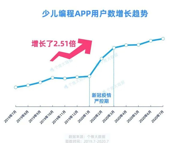而据个推大数据分析,少儿编程APP用户数持续增长,截至2020年7月,少儿编程APP用户数较2019年同期增长了2.51倍。
