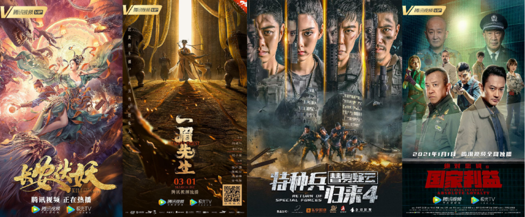 首个“网络电影春节档”期间,视频平台共上线网络电影20部,相比往年同期数量大幅提升。而据公开数据显示,2月份全网网络电影票房分账榜TOP10中大部分都是春节档上线的作品。其中腾讯视频平台的《反击》《特种兵归来4替身疑云》《罗布泊之九龙天棺》三部影片表现最佳,分列2月网络电影票房榜TOP 3。