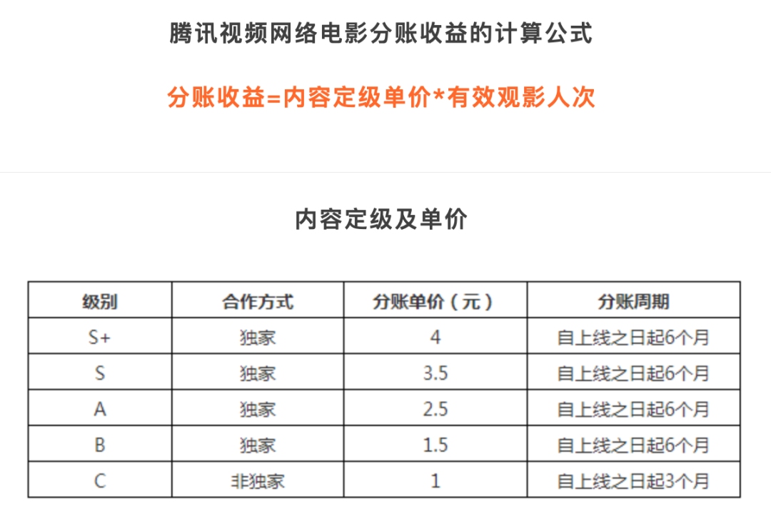 腾讯视频的新规则下,分账收益的计算公式确定为“分账收益=内容定级单价*有效观影人次”。这里的定级单价,对应腾讯视频对影片的级别评定;有效观影人次,与过去平台直接将“一次点击观看行为记为一次标准付费”的评定方法相区分。