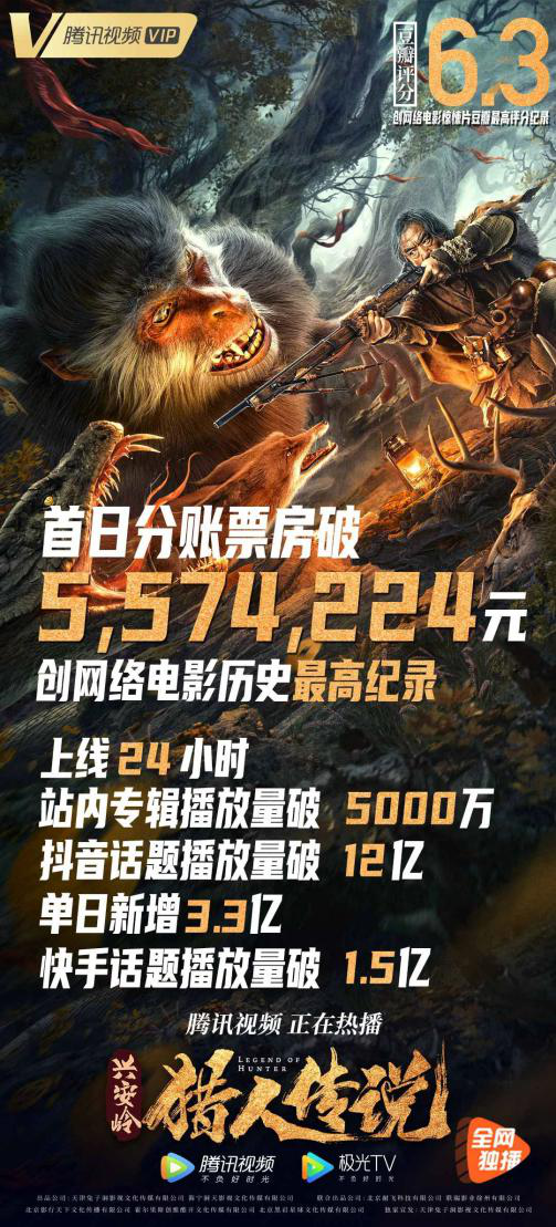 在Q2第一天,腾讯视频上线的《兴安岭猎人传说》就打破了网络电影的多项纪录,上线24小时站内专辑播放量破5000万、抖音话题播放量破12亿、首日分账票房达到557万元,豆瓣评分达到6.3,创下网络电影惊悚片豆瓣最高评分纪录,这意味着网络电影内容质量上实现的新突破。