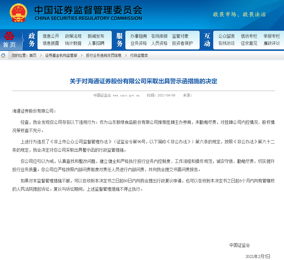 今日,证监会网站公布《关于对海通证券股份有限公司采取出具警示函措施的决定》,落款日期为2021年2月7日。证监会称,海通证券作为山东新绿食品股份有限公司推荐挂牌主办券商,未勤勉尽责,对挂牌公司内控情况、股权情况等核查不充分。证监会决定对海通证券公司采取出具警示函的行政监管措施。要求海通证券应引以为戒,认真查找和整改问题,建立健全和严格执行投行业务内控制度、工作流程和操作规范,诚实守信、勤勉尽责,切实提升投行业务质量。