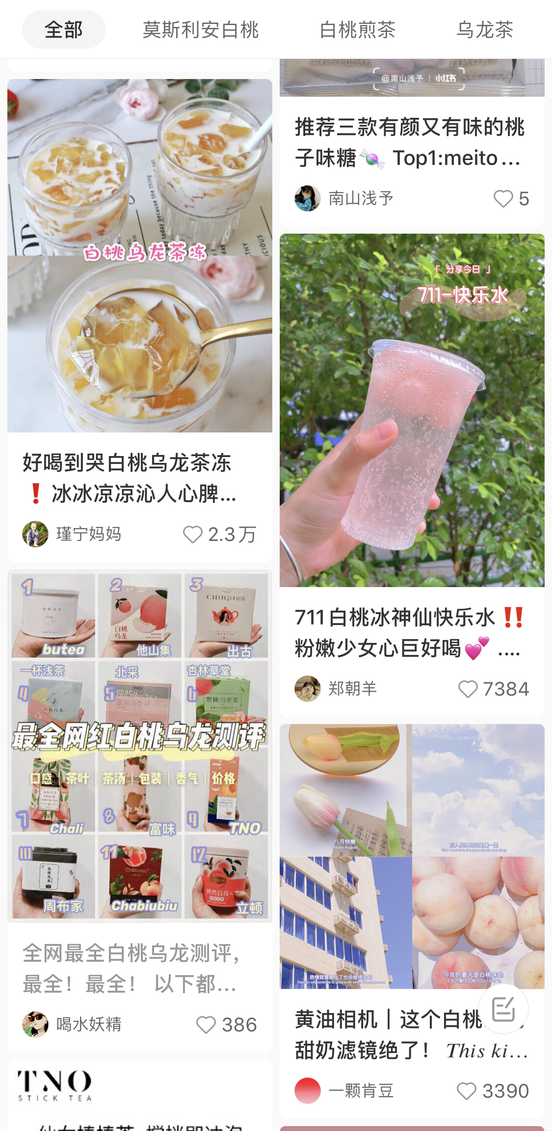 占领超市货架外,“白桃”本身已经不少社交网络平台的一个内容标签,当你在小红书上搜索白桃,就能得到数万篇相关笔记,涵盖了茶饮、汽水、蛋糕、雪糕、乳制品、香水甚至美妆和服装产品。