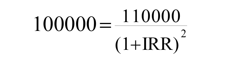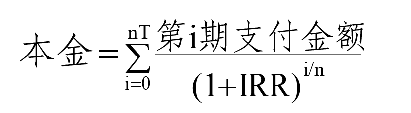 (n为年内还款频率(例如,每月还款一次为12,每3个月还款一次为4,每年还款一次为1),T为还款年数,由此计算得出的IRR即为年化利率)