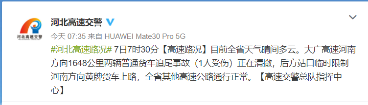 据@河北高速交警 消息,截至7日7时30分,河北省天气晴间多云。大广高速河南方向1648公里两辆普通货车追尾事故(1人受伤)正在清撤,后方站口临时限制河南方向黄牌货车上路,全省其他高速公路通行正常。