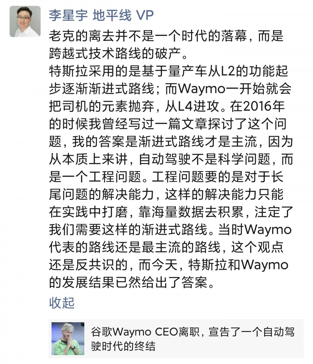 想想今年一月,John Krafik谈及了延续多年的自动驾驶路线之争,还矛头直指特斯拉,放言“特斯拉还算不上Waymo的竞争对手,因为特斯拉做的是辅助驾驶系统,而非自动驾驶系统。”马斯克发推回应:“令人惊讶,特斯拉的AI硬件和软件比Waymo的都要好。”但短短几个月后,就宣告离职,想来也令人唏嘘。