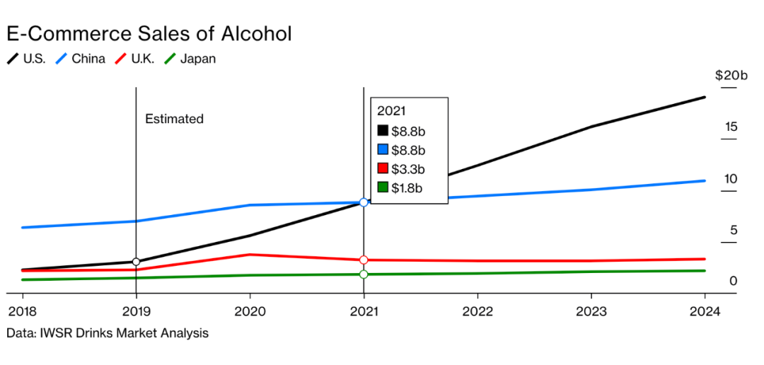 据IWSR的预测,在2019到2024年的5年内美国酒水电商市场将呈现6倍增长,并在2021年超过中国成为最大的酒水电商市场,主要推力来自于疫情环境下政策放宽以迎合酒水线上购买及到家配送,传统酒水零售商和超商逐渐加码线上渠道,按需外卖服务所占的比重也越来越大。