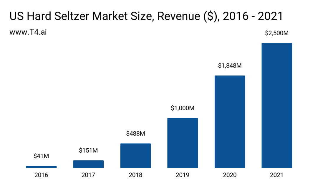 酒精气泡水 (hard seltzer)处于低酒精浓度和即饮类产品的交叉点,成为了近两年最火的酒饮品类。据Allied Market Research数据显示,全球酒精气泡水市场将在2021到2027年以12.7%的复合年均增长率在2027年达到109.2亿美元,其中美国酒精气泡水的市场增速最快。