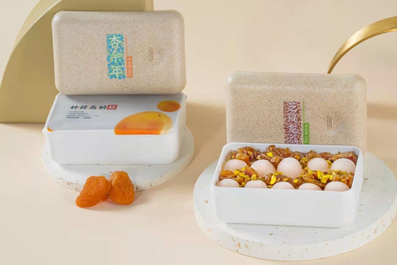 从容量上看,这款产品是同品牌片状雪糕的近4倍,更接近于小家庭分享装、或聚会分享装的容量。而产品定位,则更接近于甜品店甜品,比如“杏余年”内有杏脯、桃子味雪糕、坚果,而“芝玫龙荔”则有荔枝状的冰球、奶酪和荔枝冰淇淋、坚果碎、桂圆,盛放在中式食盒样式的冰淇淋杯中。