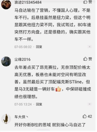 的确有粉丝为其开脱。一名用户发帖称:“后悬挂虽然是扭力梁,但这个明显跟其它扭力梁不同,我试驾过,80车速突然打方向盘还是很稳的,确实和其它车不一样。”