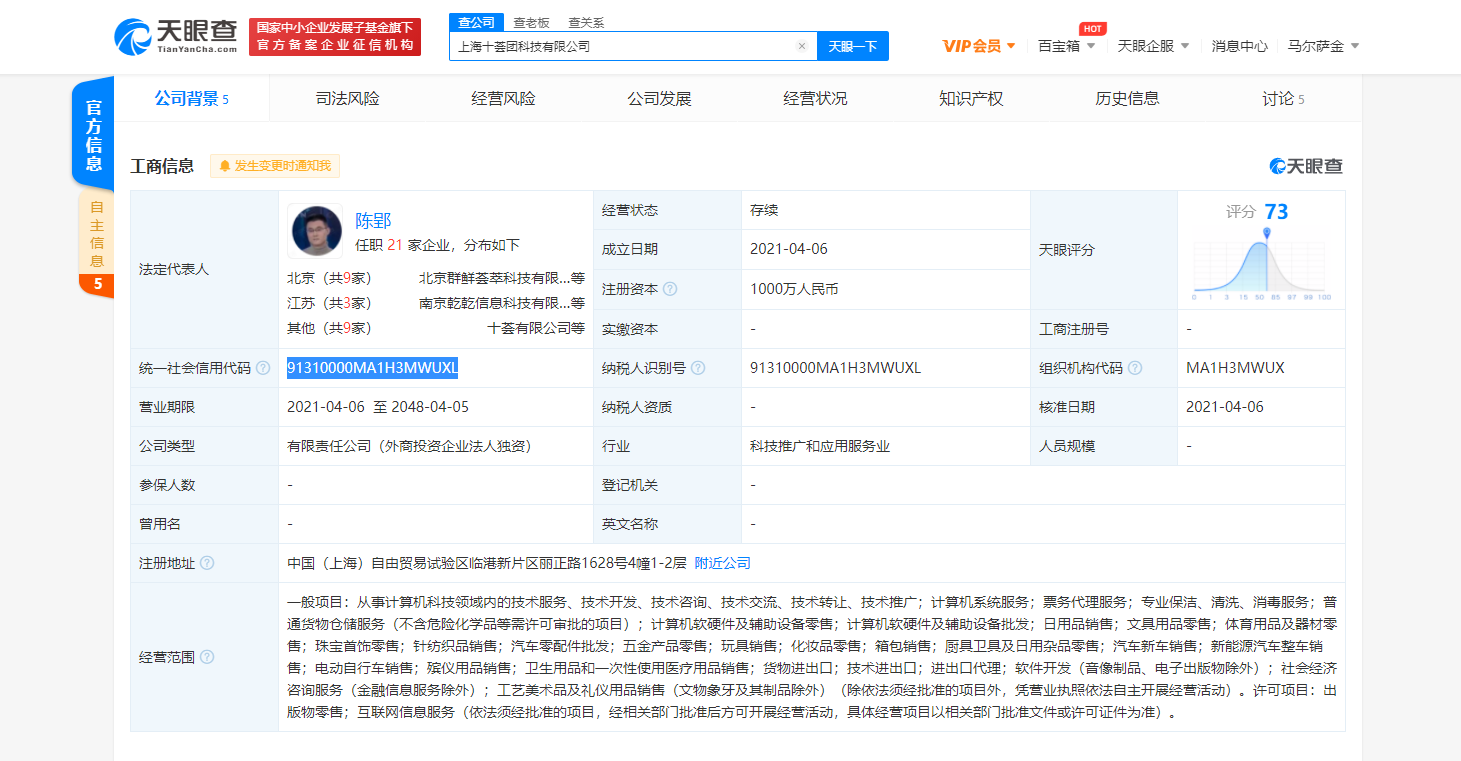 据天眼查APP显示,4月6日,上海十荟团科技有限公司成立,注册资本1000万人民币,法定代表人为陈郢,经营范围包括从事计算机科技领域内的技术服务;专业保洁服务;珠宝首饰零售;新能源汽车整车销售;出版物零售;互联网信息服务等。天眼查股权穿透信息显示,该公司由北京群鲜荟萃科技有限公司全资持股。